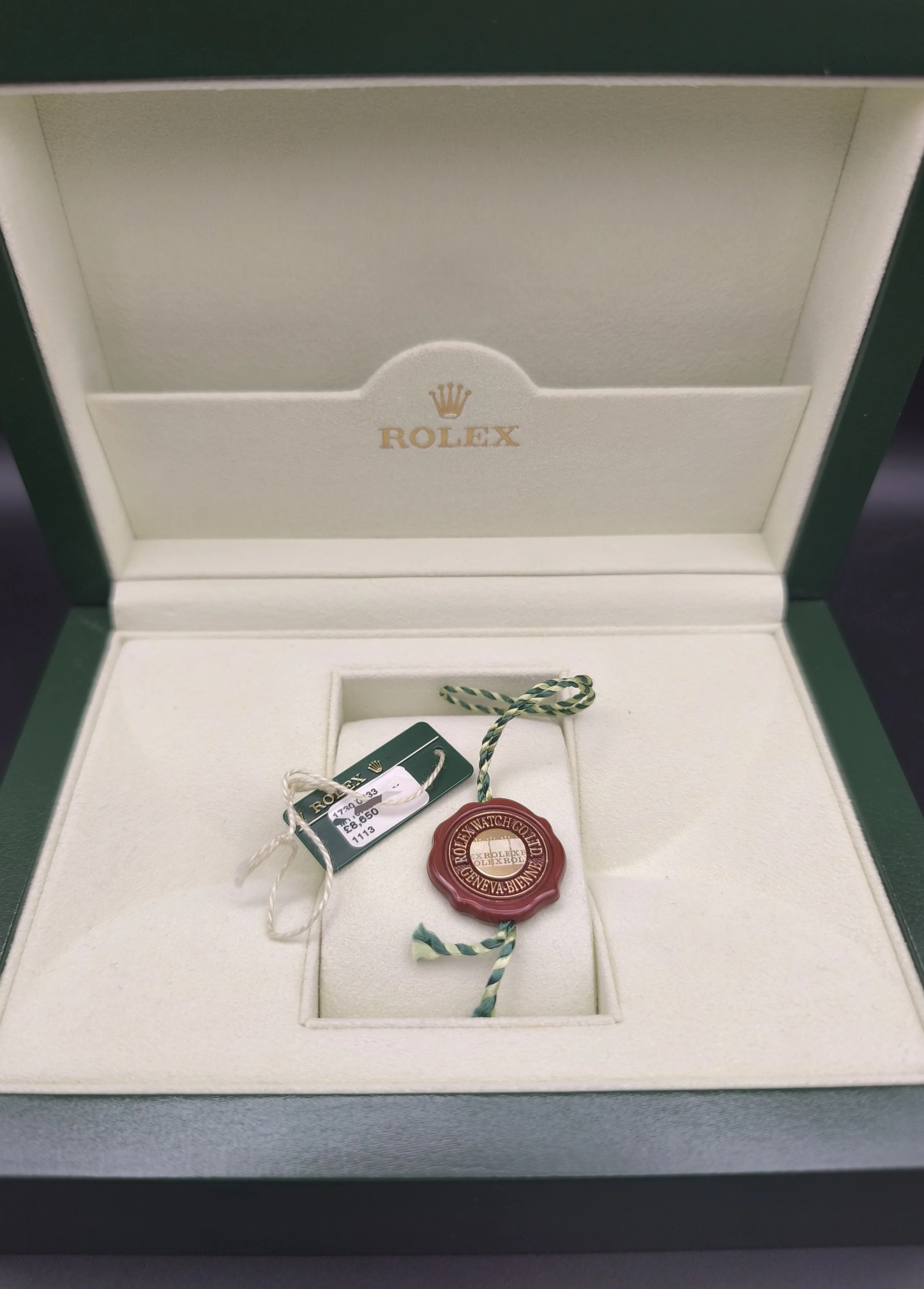 This comes as a full set, apart from the very outer card box cover. Original purchase receipt, all tags, card, instruction manual, leather wallet, cloth and green box.