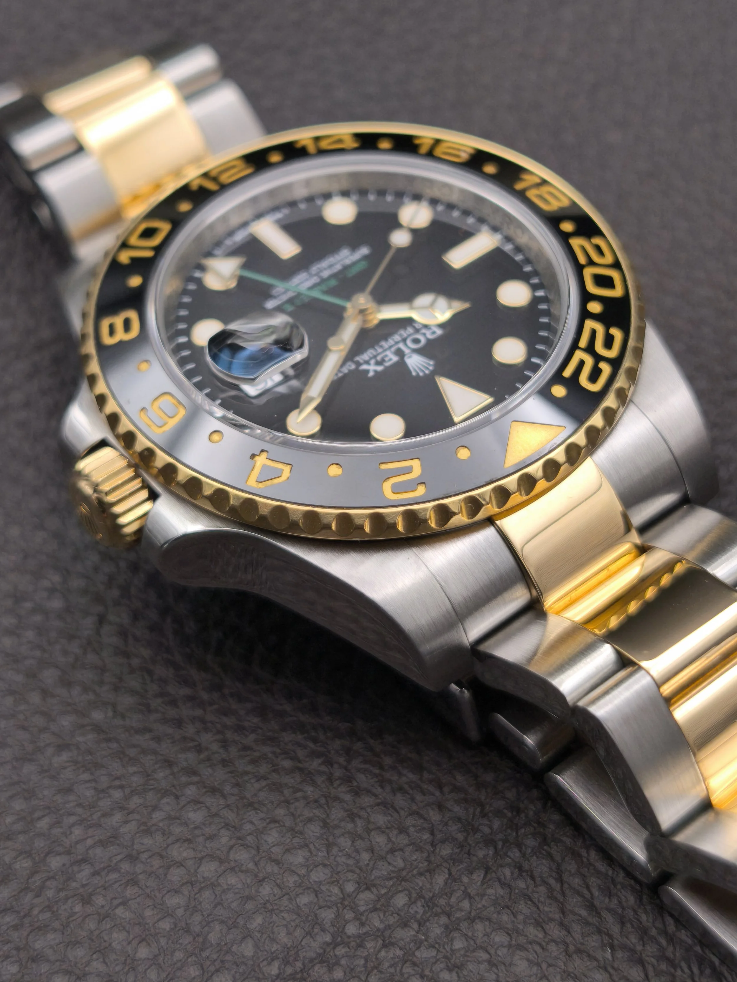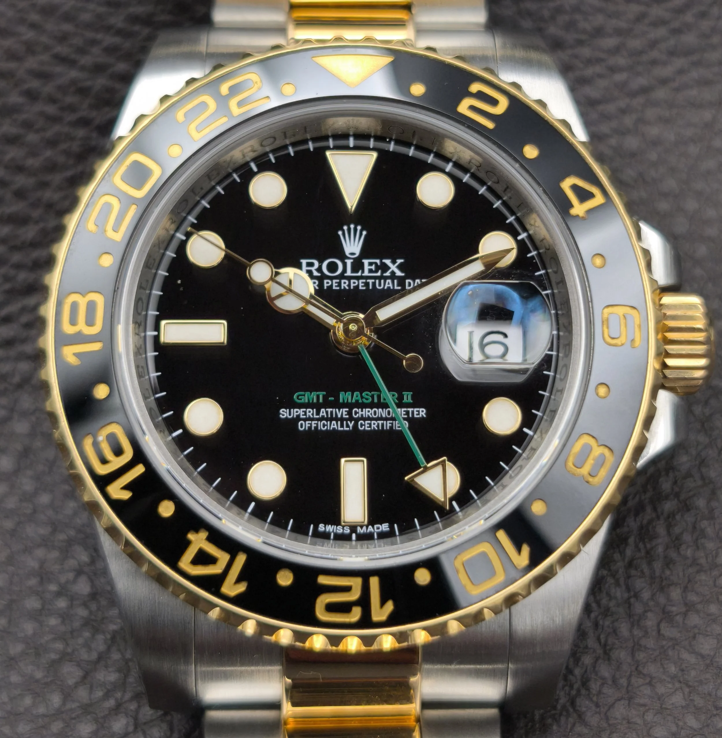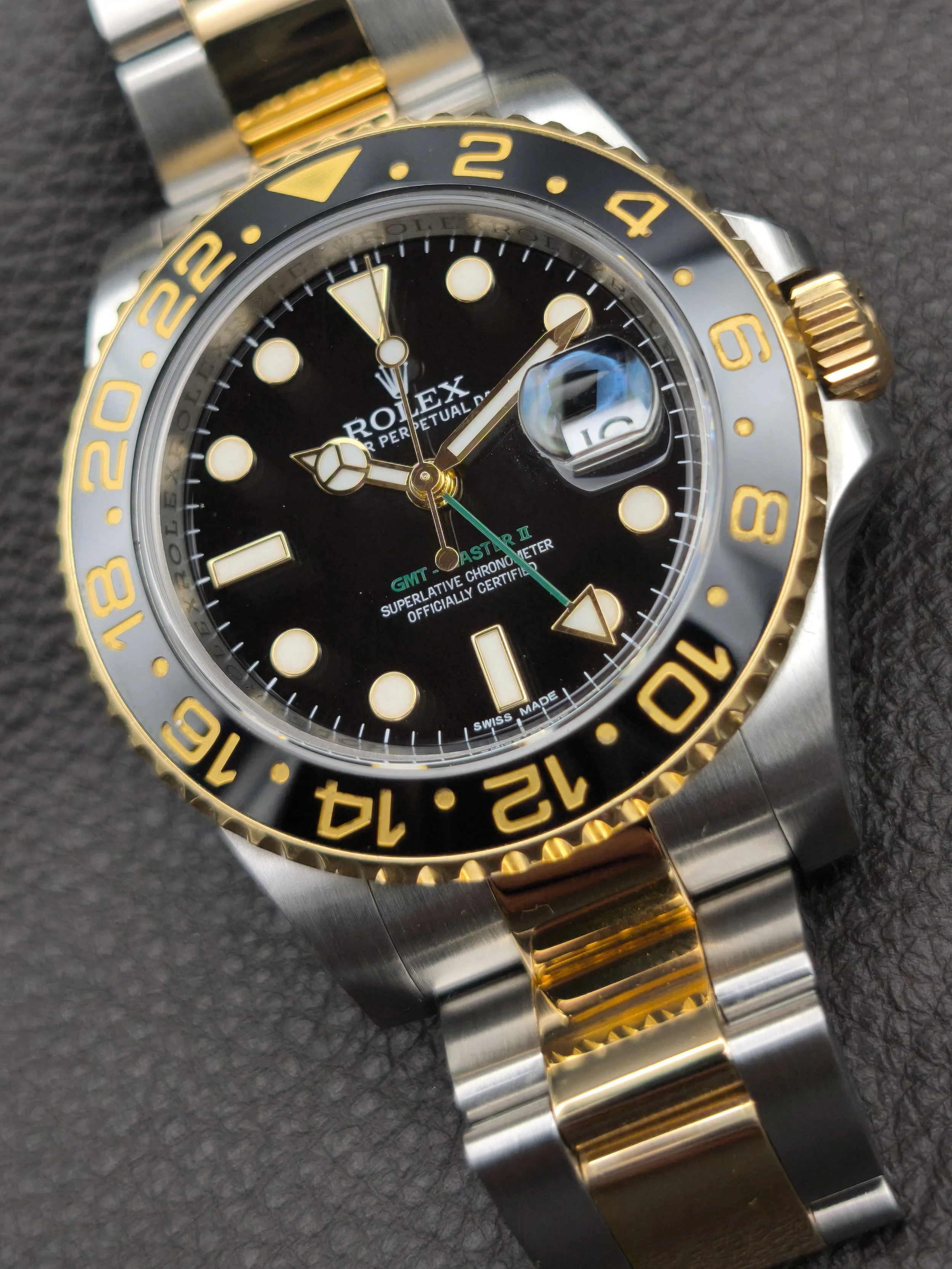 The introduction of the 6-digit generation of GMT Master II's in 2005 saw many modern upgrades. This included a brand new movement, a redesigned bezel with a (Cerachrom) ceramic insert, 24 clicks instead of 120, a newer case with more robust lugs and a larger crown guard, a new-style bracelet with polished center links and a solid clasp, a Maxi dial topped with larger hour markers, wider Mercedes hands, and bold, green accents. This ref: 116713LN is the Yellow Rolesor variation of the collection. A pairing of 904L-grade Oystersteel with 18 karat yellow gold, both of which are forged in the Rolex factory foundry.