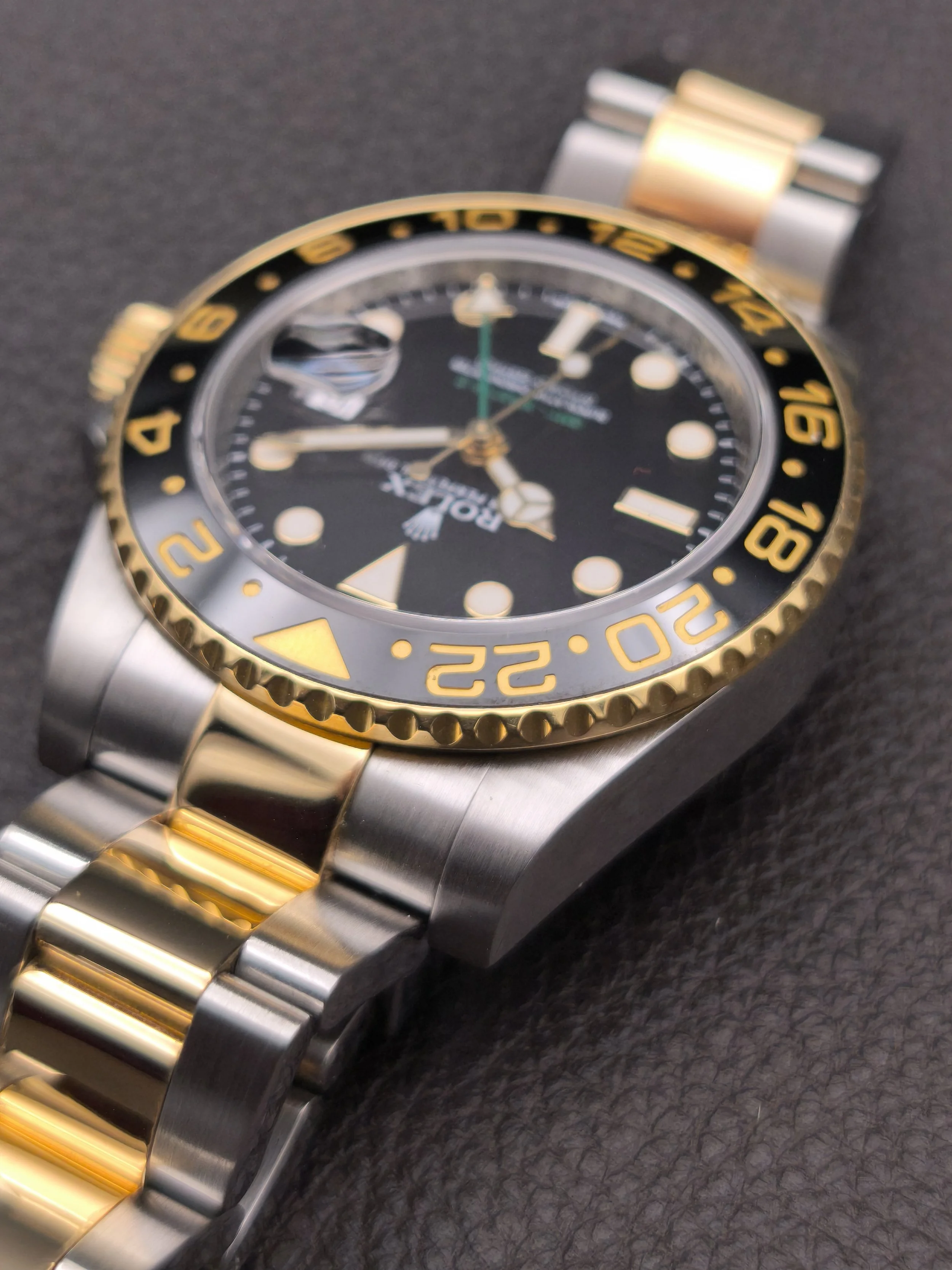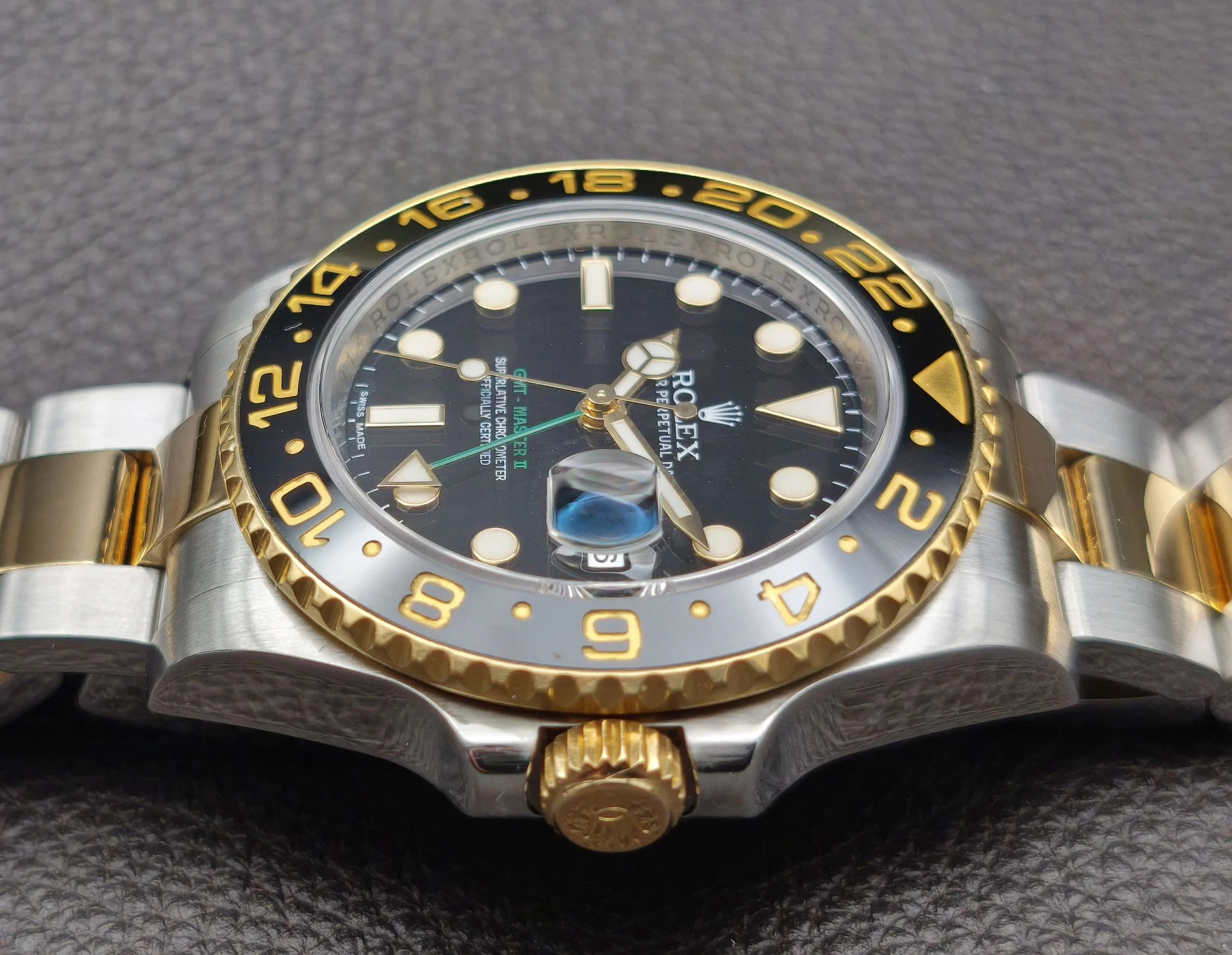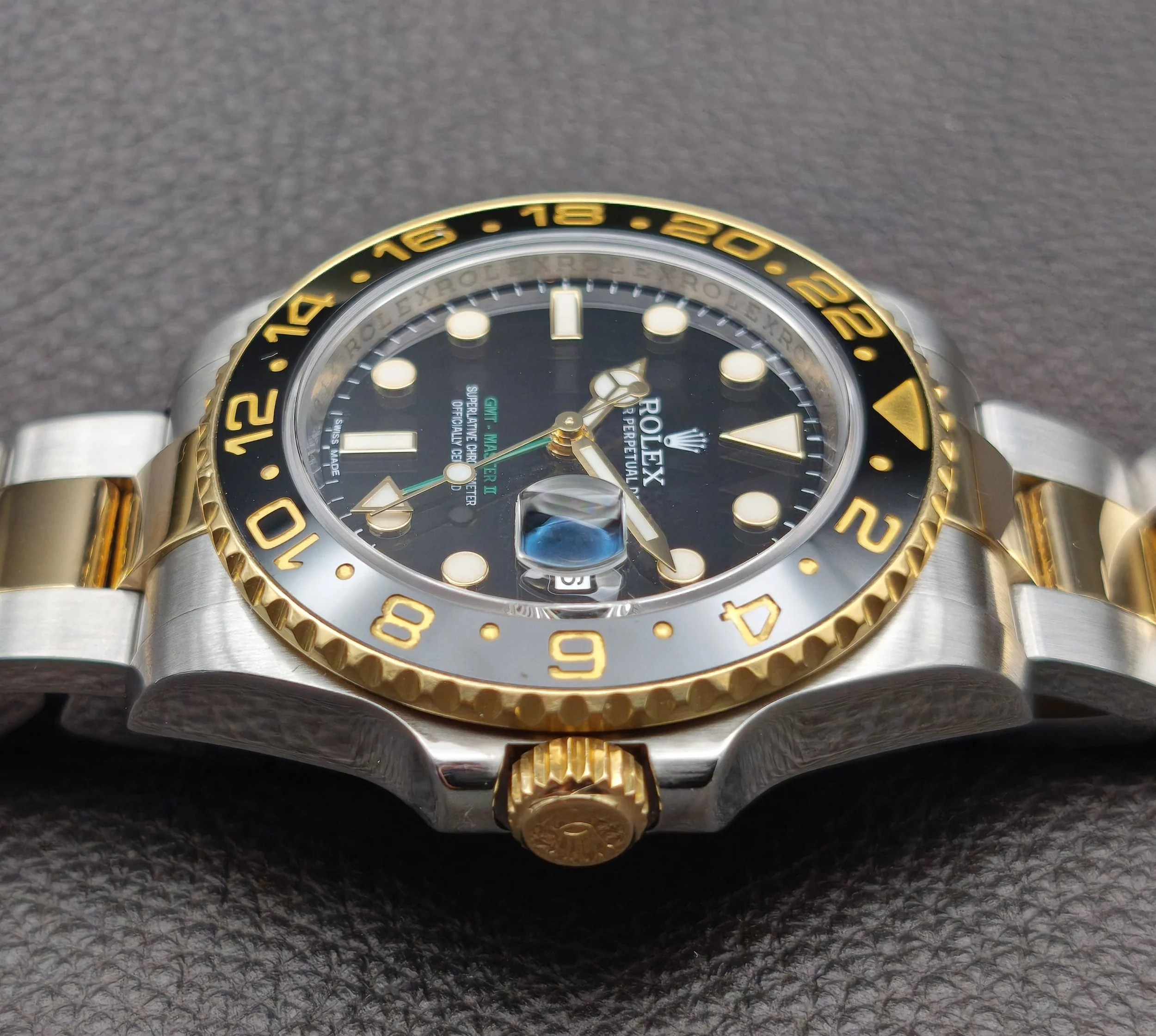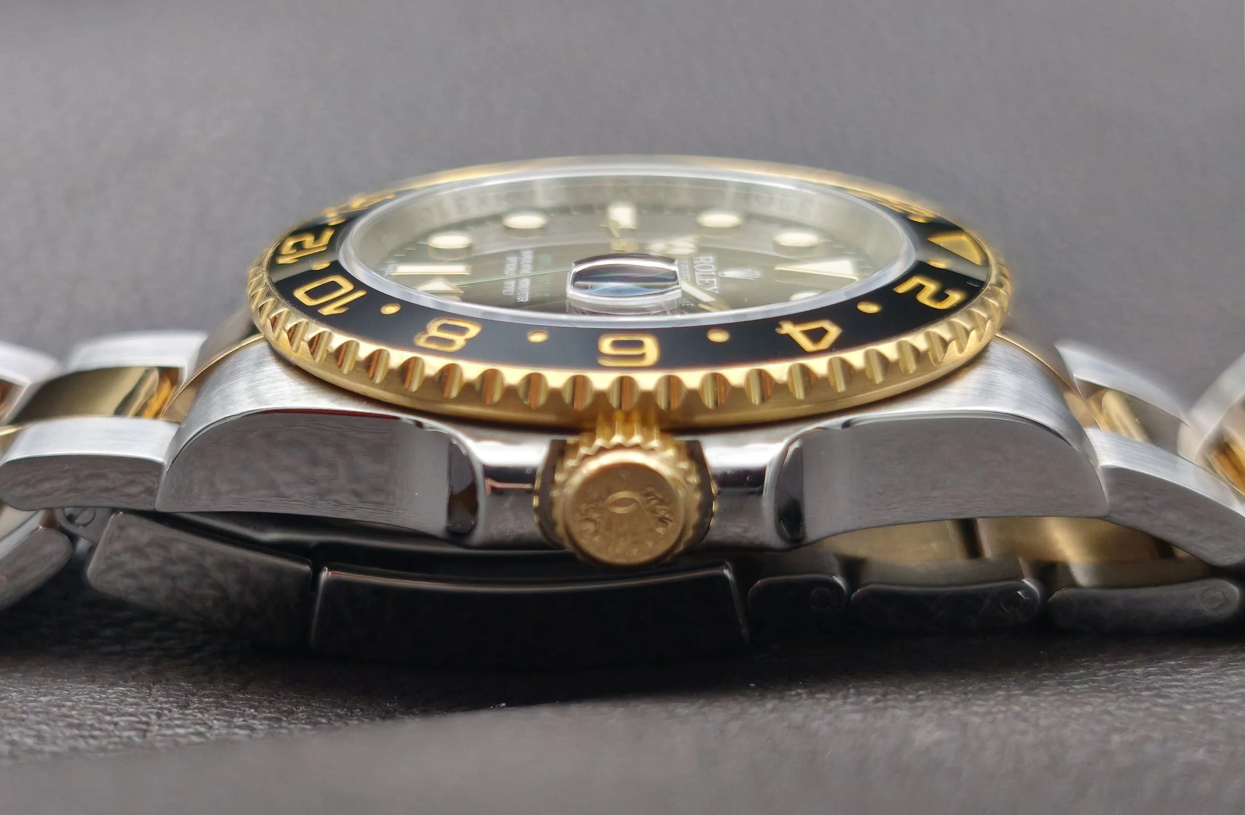 The introduction of the 6-digit generation of GMT Master II's in 2005 saw many modern upgrades. This included a brand new movement, a redesigned bezel with a (Cerachrom) ceramic insert, 24 clicks instead of 120, a newer case with more robust lugs and a larger crown guard, a new-style bracelet with polished center links and a solid clasp, a Maxi dial topped with larger hour markers, wider Mercedes hands, and bold, green accents. This ref: 116713LN is the Yellow Rolesor variation of the collection. A pairing of 904L-grade Oystersteel with 18 karat yellow gold, both of which are forged in the Rolex factory foundry.